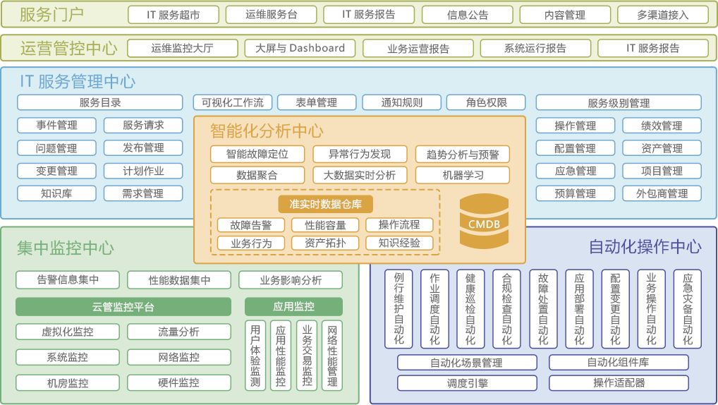 SIMO全棧功能模塊以實用為宗旨,以??榛?、服務化為設計理念,其主要??榘?個中心、1個門戶——集中監控中心、IT服務管理中心、自動化操作中心、智能化分析中心、運營管控中心,以及服務。